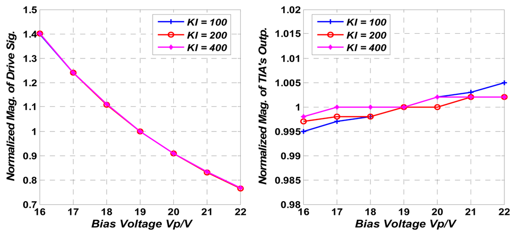 Both the magnitude of the drive signal and the TIA's output are recorded in Table 5 with three different values of KI and under different Vp ranging from 16 V to 22 V. The percentages of variation of these two signals are calculated by setting Vp = 19 V as reference and D.R.C.s are calculated from Equation (11). As shown in Table 5, the D.R.C. is increased 6 dB when KI is doubled from 100 to 200. This result shows a close agreement with both the theoretical and simulation results. When KI is increased from 200 to 400, the D.R.C. is increased only about 3.6 dB. As the minimum stable bit is the sub-mV bit in the AC magnitude measurement, it is believed that the improvement of D.R.C. is limited by the noise in the control loop. Figure 13 shows normalized magnitude of drive signal and TIA's output with different KI by varying Vp. The benefits of the control loop's D.R.C. can be observed directly in Figure 13.