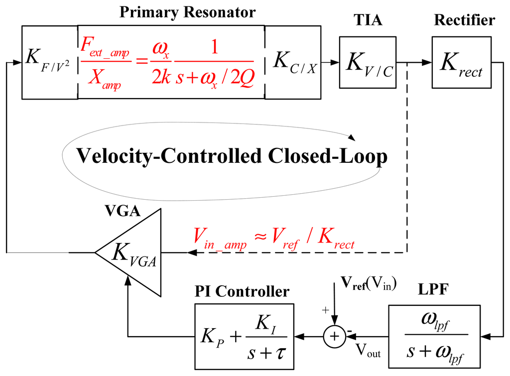 The topology of the AGC-PI based velocity-controlled closed-loop for the drive mode of MEMS gyroscope is shown in Figure 1. The displacement of sense comb fingers induces an alternating current, which is converted to voltage by the trans-impedance amplifier (TIA). The voltage is fed into the variable gain amplifier (VGA) to generate the excitation signal. The TIA, VGA and primary resonator of the gyroscope form an electromechanical oscillator. The vibratory velocity of this electromechanical oscillator is controlled to a target value Vref by an AGC, which consists of rectifier, low pass filter (LPF), proportional and integral (PI) controller and VGA. In the AGC, the rectifier and LPF extract the amplitude information of the vibratory velocity and then compare it with the target value Vref to obtain an error signal Verror. The error signal is amplified and integrated by the PI controller and then transmitted to adjust the gain of the VGA. The control loop achieves a steady state until the error signal is zero.