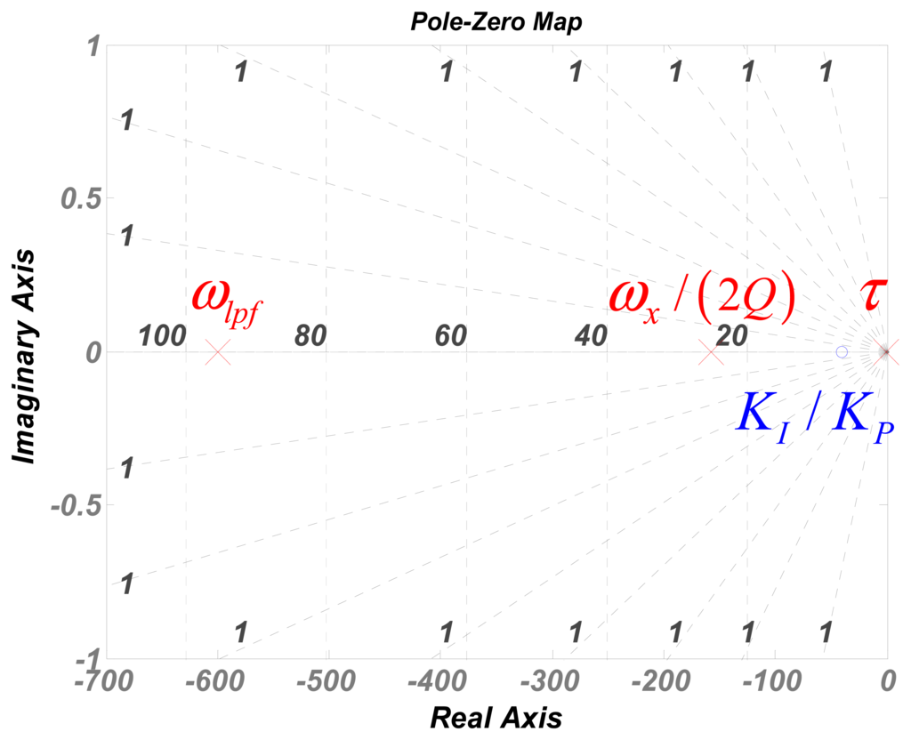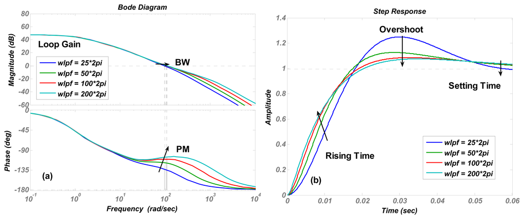 The expressions of the bandwidth and phase margin can be calculated by solving a third-order equation generated from Equation (4). However, the solution process is very complex. Let the negative zero KI/KP equal to the pole ωx/(2Q). As a result, a zero-pole doublet is constructed and the 3rd order system is reduced to a second-order system. The validity of the order reduction will be revealed in following numerical simulations. The order-reduced transfer function from Equation (4) can be rewritten as: