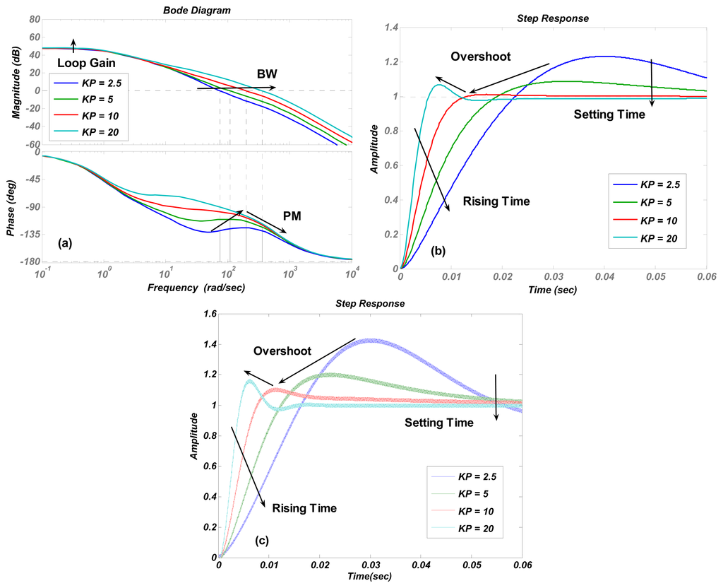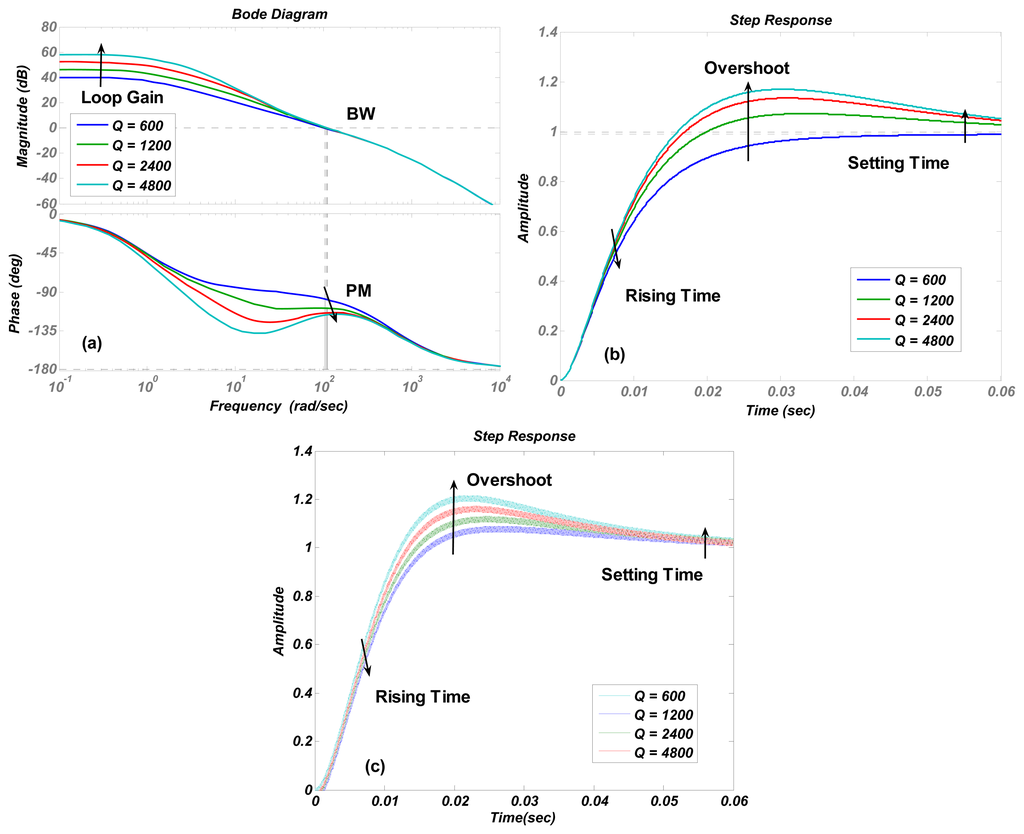 Figure 6a shows that increasing the proportional term KI is an effective way to enlarge the loop gain. However, it causes an obvious decrease in the phase margin and only a little increment in bandwidth. The trends of curves in Figure 7a are identical to those in Figure 6a, but the phase margin and bandwidth variation quantity is less than those in Figure 6a, which indicates that the stability and recovery speed of the control loop is more robust under the variation of quality factor Q than that of KI. It is believed that the phenomenon is decided by zero and poles locations. This conclusion is verified by simulations with different parameter settings, but not shown as the long paragraph. The curve trends in other figures all agreed with the results in Table 2.