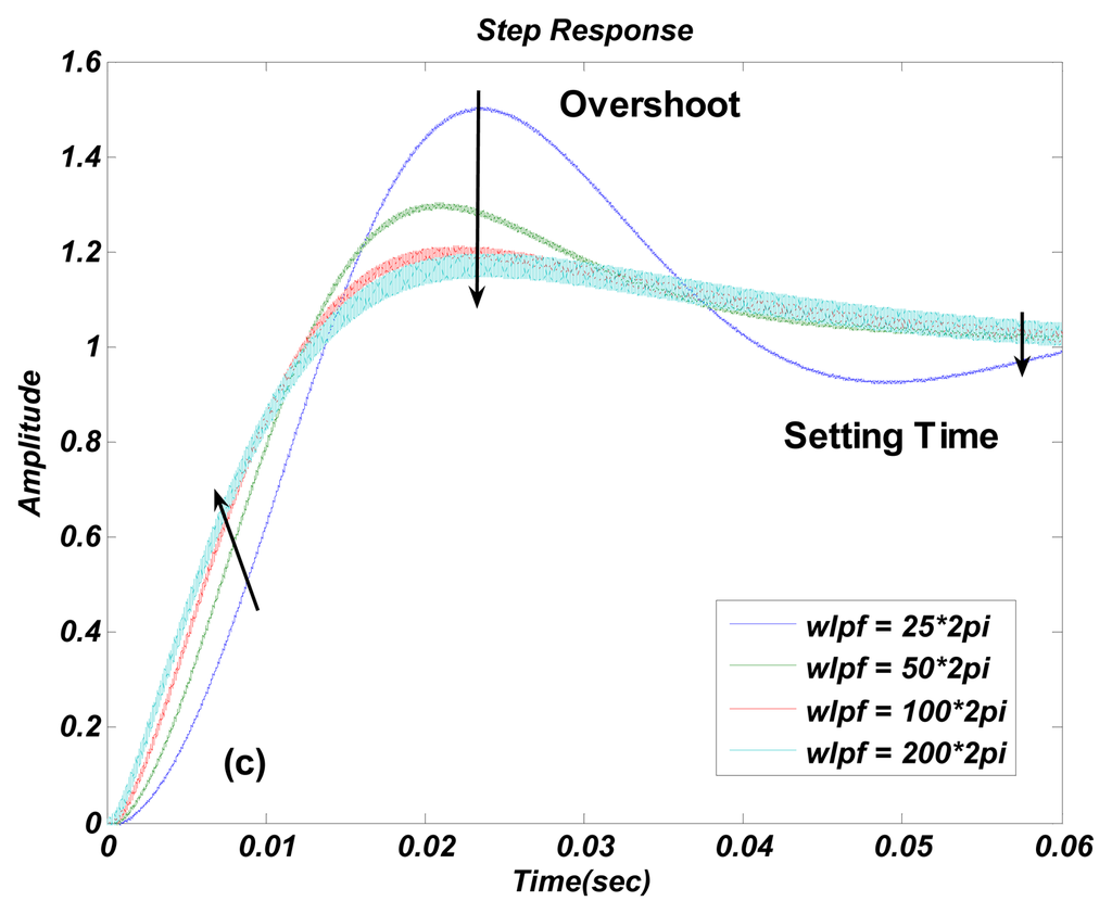 The numerical simulations are carried out in Matlab. The simulation results of the transfer function in Equation (4) are shown in Figures 4, 5, 6, 7 and 8a with varying KP, ωlpf, KI, and Q. The corresponding step responses at the LPF output terminal of the proposed closed-loop linear model are also given in Figures 4, 5, 6, 7, and 8b. To verify the validity of the proposed linear model, a nonlinear model is built by Simulink and step responses at the LPF output terminal of corresponding nonlinear model are shown in Figures 4, 5, 6, 7, and 8c. As a 1st-order low pass filter is used in the nonlinear model, the curves in Figures 4, 5, 6, 7, and 8c contain residual resonance-frequency related components and seem noisy.