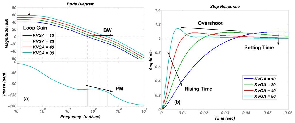 According to Equation (6), Equations (9) and (10), each performance specification variation trend versus the primary system parameters are summarized in Table 1. As shown in the table, the performance specifications of the control loop contradict each other. Increasing the loop gain improves the disturbance rejection capability and the control accuracy of the system, while sacrificing the phase margin as well as the stability. Extending the bandwidth increases the response speed of the control system, but may reduce the phase margin and cause an unstable oscillation. As a result, some trade-offs should be made to achieve a precise, stable and swift control loop.