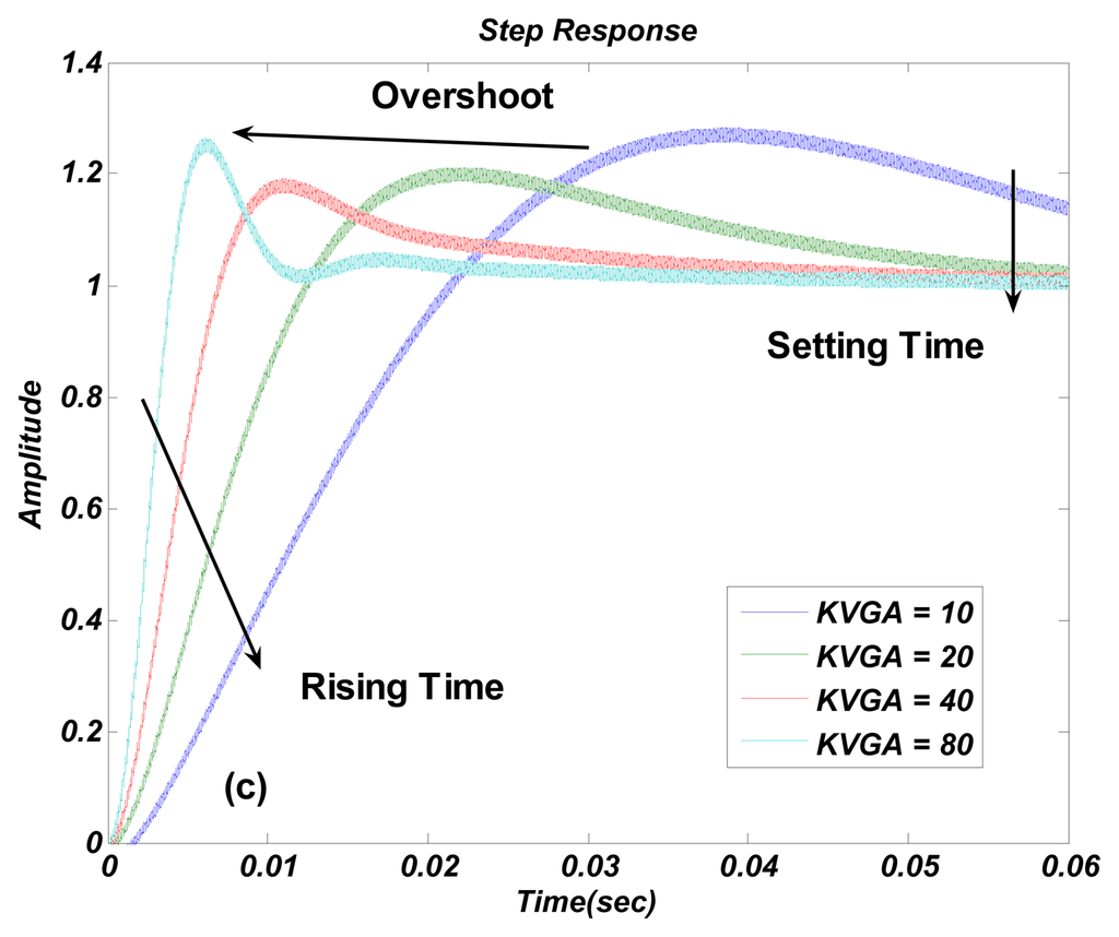 The step responses of the nonlinear model in Figures 4, 5, 6, 7, and 8c are similar to those of the linear model in Figures 4, 5, 6, 7, and 8b. However, the simulation responses of the nonlinear model have shorter rise time and larger overshoot than those of the linear model. The difference is probably caused by fixing VGA input as its final value Vref/Krect, which dismisses the action of drive loop in the actual nonlinear model.