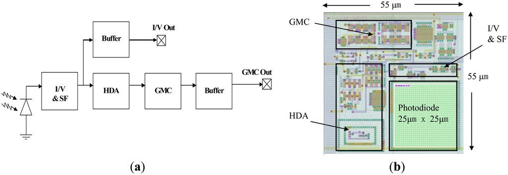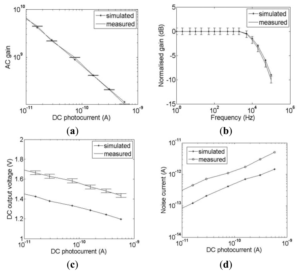 Characterization of the sensor array was carried out using the system shown in Figure 3 in which the DC response of the current to voltage converter and AC responses of the current to voltage converter, HDA and GMC are characterized and compared with simulations. Figure 7 shows the characterization results for the current to voltage converter. Four main characteristics of AC gain, bandwidth, DC response and noise current are investigated. Figure 7a demonstrates that the AC gain is dependent on the DC photocurrent as expected from the logarithmic response described in Section 2. The error bars indicate the standard deviation of the AC gains for the 4096 pixels of the array. Typical simulation results obtained from a VLSI design tool, Cadence (Spectre, San Jose, CA, USA), are also plotted for comparison. Both measured and simulated AC gains are similar.