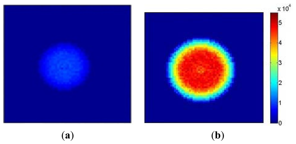 Figure 10a shows a flow image obtained with an aperture diameter of 2 mm and 5% modulation depth at 5 kHz using the setup illustrated in Figure 4. As expected the high flow (1.3 × 104 a.u.) at the central bright spot and the low flow (2 × 103 a.u.) in the outer region can be observed. Figure 10b shows an image at an aperture diameter of 3 mm, 8% modulation depth and frequency of 8 kHz. The central bright spot expands and flow values also increase by a factor of approximately 4 (4.8 × 104 a.u.) while the surrounding area maintains a low flow value. The results demonstrate that the sensor can discriminate between a modulated light signal in a relatively high DC background. As anticipated from Equation (1) the flow value increases linearly with modulation frequency and changes as the square of the modulation depth. The transition ring observed in Figure 10b was due to the edge effect of the aperture.