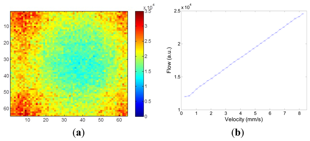 Figure 11b shows the radial profile of flow values averaged over all radial positions with the error bars denoting the standard deviation of the measurements at each radial position. As expected the averaged flow increases linearly as the velocity increases. At very low speed (<1 mm/s) an offset due to the noise floor of the system can be observed.