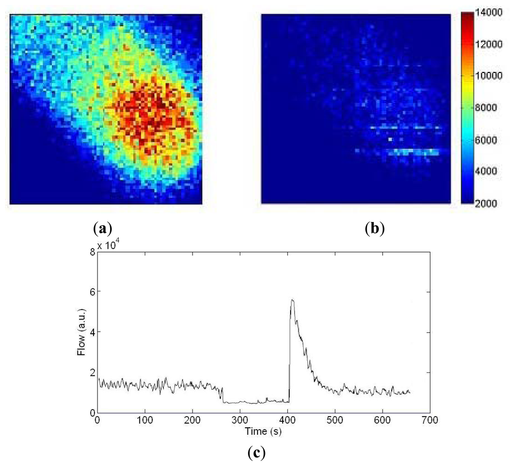 Figure 12a,b shows blood flow images of a finger before and during arterial occlusion. The fingertip has higher blood flow (1.4 × 104 a.u.) than the intermediate phalange (0.7 × 104 a.u.). In Figure 12b the flow drops down to 0.3 × 104 a.u. during occlusion. To demonstrate the long-term measurement capability, Figure 12c shows a trace of the flow values at the center pixel on the finger images with arterial occlusion at 180 mmHg for 2 min using a pressure cuff placed around the base of the finger. The transient increase in flow above resting flow during the post occlusive reactive hyperemia response can be observed.