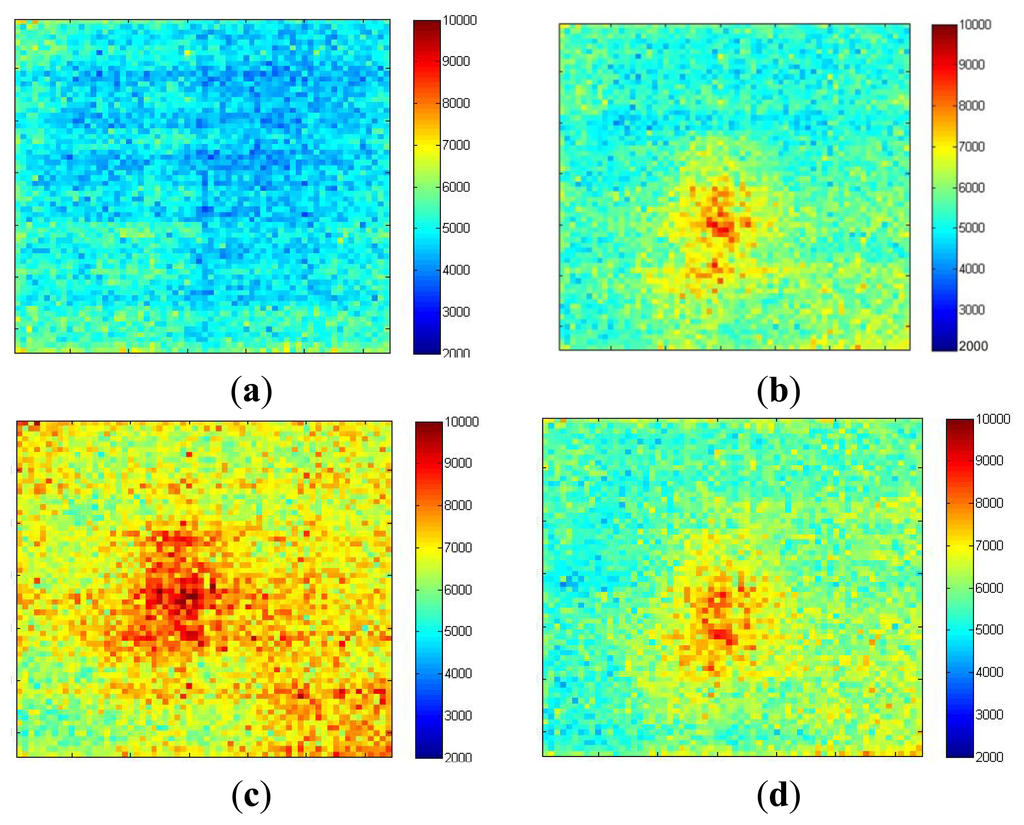 Imaging of an inflammatory response is carried out in order to demonstrate the sensor's ability to monitor gradually developing, sustained localized increases in blood flow. Ten mg/mL histamine was placed on the forearm, pricked gently with a sterile lancet (under ethical approval). The skin prick was performed as quickly as possible and imaging resumed immediately after. Figure 13a shows the blood flow image captured immediately after the histamine skin-prick. It has a relatively flat flow profile with an average of 4 × 103 a.u. The horizontal stripe pattern illustrates the influence of blood pulsations during the data collection (discussed in Section 5). After 10 min (Figure 13b) a 0.5 cm × 0.5 cm circular area centered on the site of the skin prick developed with high flow (8 × 103 a.u.). Figure 13c shows that after 20 min the inflammatory area expanded to 1 cm × 1 cm with increased flow of 9 × 103 a.u. and the flow over the surrounding area also increased to 7 × 103 a.u. After 30 minutes (Figure 13d) the size of the inflammatory area decreased to 0.6 cm × 0.6 cm with reduced flow of 8 × 103 a.u.