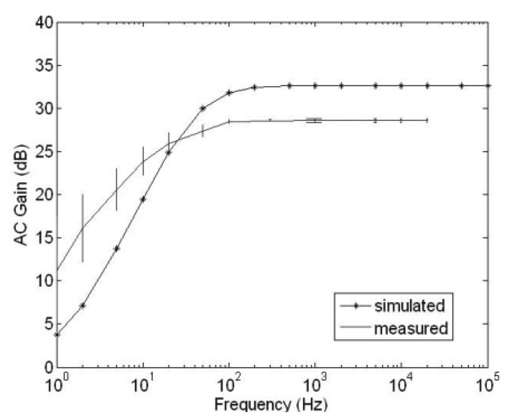 The frequency response of the HDA is characterized and shown in Figure 8. The lower cut-off frequency is 20 Hz while the simulation result is at 100 Hz which is likely to be due to the “inverted inverter” structure in the HDA which is not accurately modeled by the simulator.