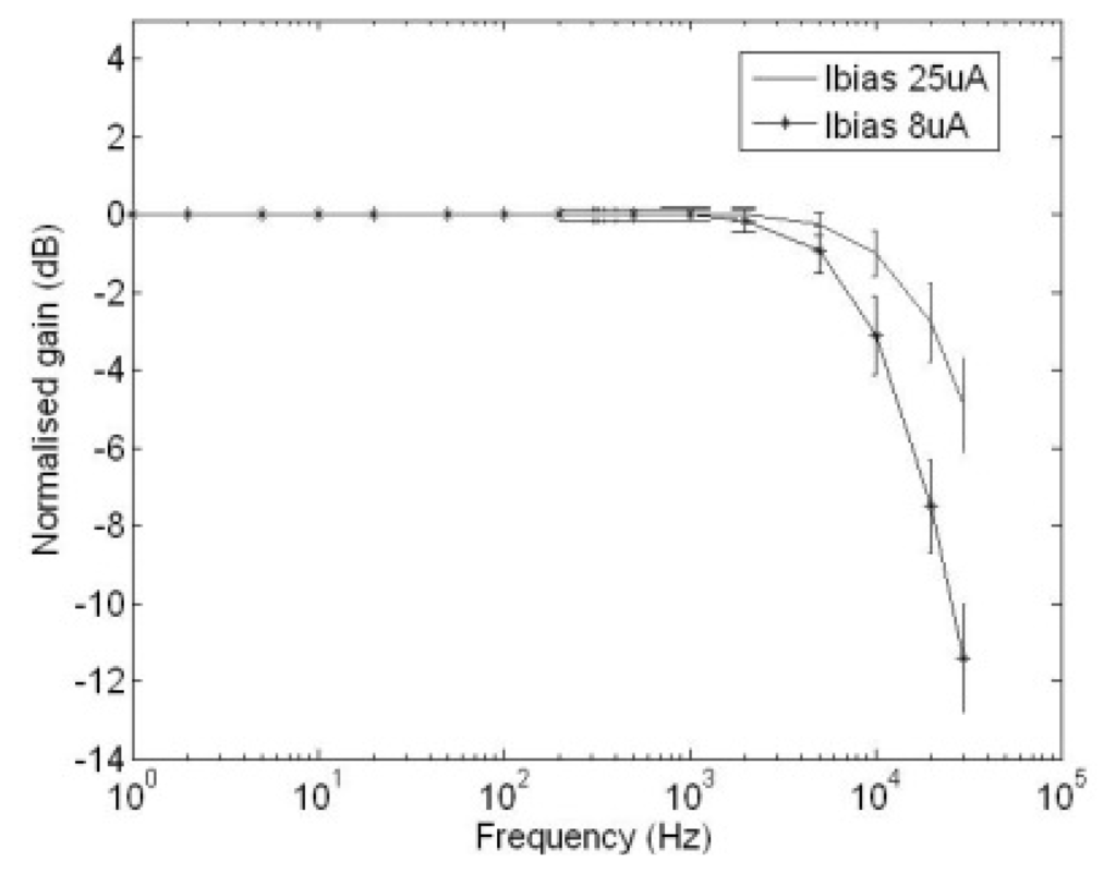 Figure 9 illustrates the frequency responses of the GMC when the bias currents flowing through the external resistor are 8 μA and 25 μA respectively. It can be seen that in order to achieve a 20 kHz cut-off frequency from the GMC to avoid aliasing at a 40 kHz sampling frequency, the bias current of the GMC must be set at 8 μA.