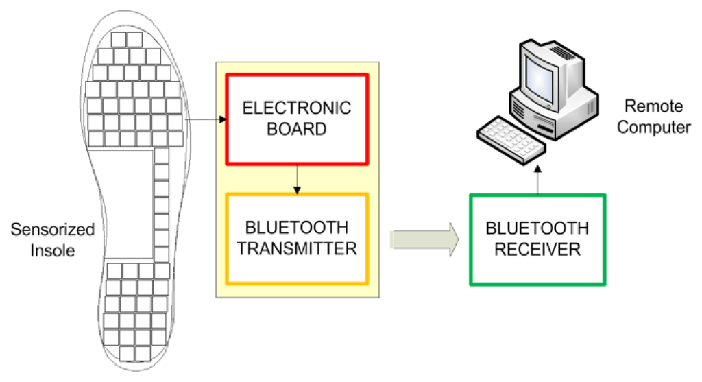 The pressure-sensitive foot insole comprises two main parts: the transduction unit and the on-board electronics for signal conditioning and data transmission. A conceptual description of the system architecture is given in Figure 1.