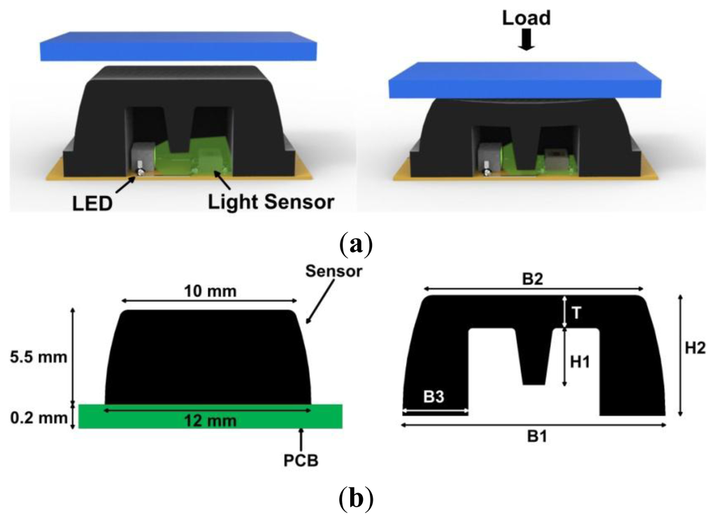 The transduction mechanism acts as described in the following: when a load is applied on the top surface of the cover, the silicone bulk deforms itself and the curtain gradually closes the light path between the emitter and the receiver, and thus the output voltage changes. The sensor thus works as a force-to-voltage transducer. The dimension of the frustum base is 12 × 12 mm2, while the top face is 10 × 10 mm2, and the height is 5.5 mm (Figure 2b). The contact surface provides a spatial resolution of 1 cm2.