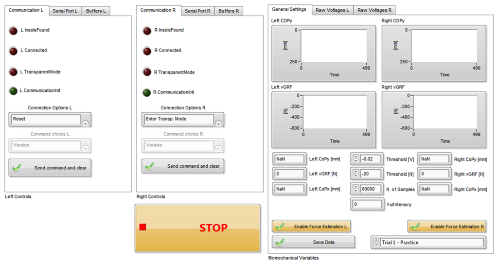 Data from the pressure-sensitive insoles are received, real-time processed and stored on the remote PC by means of a custom Labview routine (National Instruments Inc., Austin, TX, USA) with a graphical user interface (GUI). Data from the pressure-sensitive insoles can be received by any remote device (PC, tablet or smartphone) equipped with custom Bluetooth receivers, engineered by Robotech. A 921.6 Kbit/s connection is required to sustain a 100 Hz communication rate. An overview of the GUI is given in Figure 5.