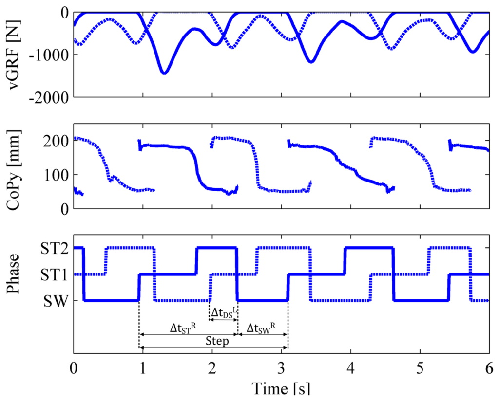 Raw voltages and biomechanical variables (namely the coordinates of the CoP and the νGRF) from both pressure-sensitive insoles, along with online computed gait phases, were synchronized with force plate output data through a synchronizing event recorded by all apparatuses. All data were then stored in a file for offline analysis.