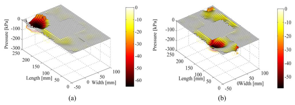 An example of pressure maps that can be extracted from the developed pressure-sensitive insoles is reported in Figure 7: the reported maps depict typical under-sole pressure patterns for Subject #1 during the weight acceptance phase (Figure 7a—pressure is under the heel—and the push-off phase—pressure distribution is mostly under the forefoot area (Figure 7b).