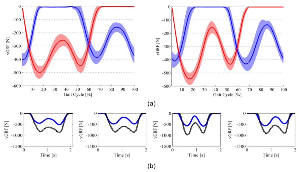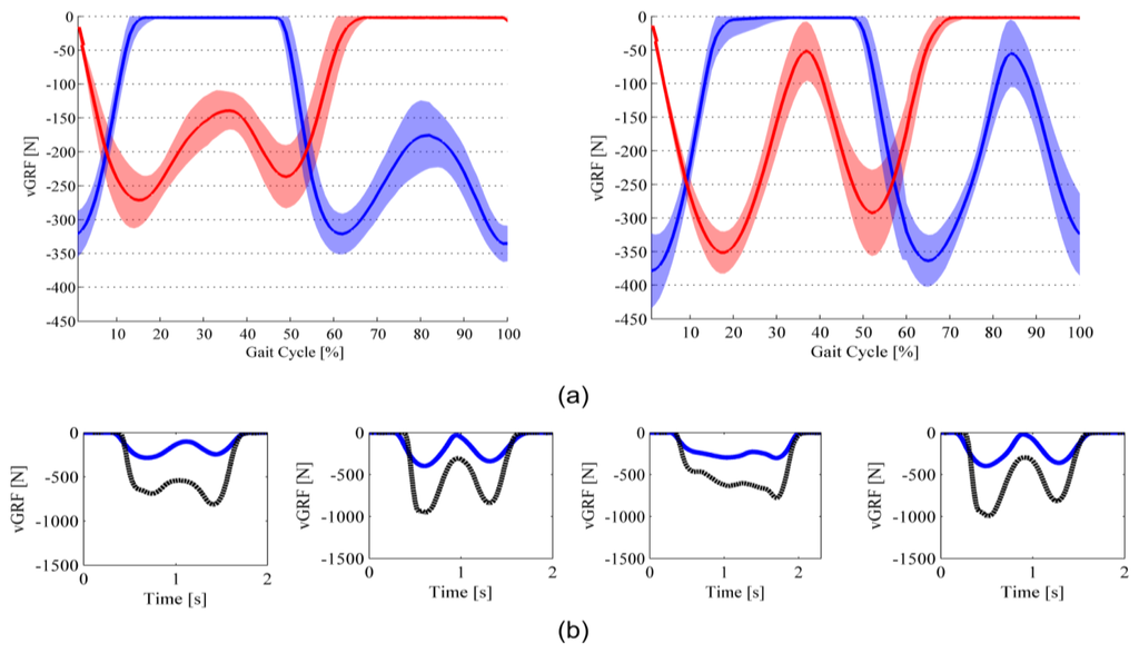 The νGRF profiles of steady-state steps for Subject#1 and Subject #2 are shown in Figures 8 and 9. νGRF profiles of both left and right feet are shown in Figure 8a and Figure 9a (data are averaged across all recorded steps—about 50 steps for each subject and each speed condition—(solid line), and shown along with the standard deviation contour (shadowed).