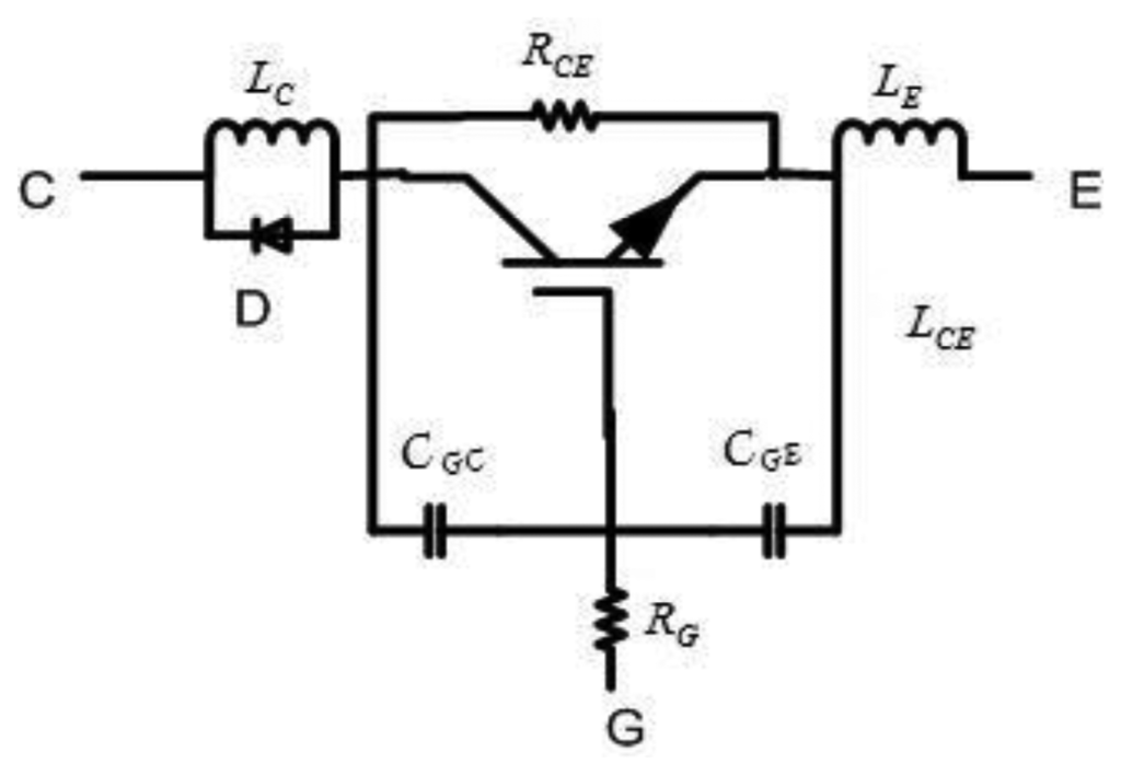 MOSFETs are widely used in electric systems as ideal on-off switches, but some fail to take into account their actual equivalent circuit, which is shown in Figure 1. It has energy storage element distributed parameters such as inductor, capacitor, and resistance (i.e., CGE, CGE, LC, LE, RG, etc.), which have inherent nonlinear characteristics.