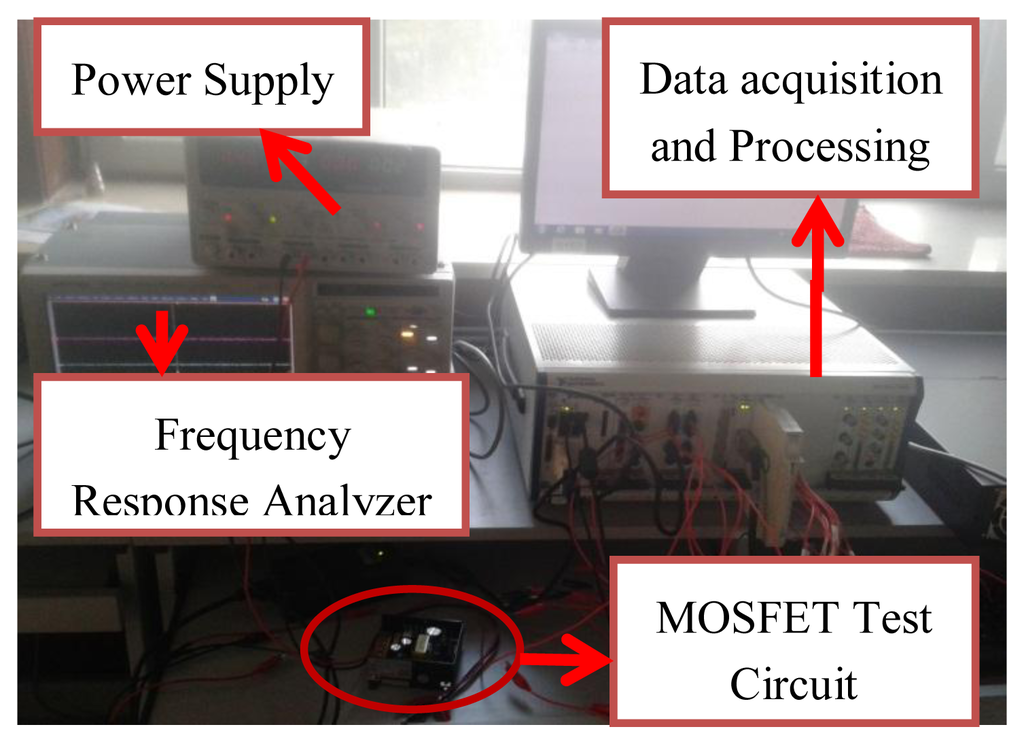 The performance of the presented monitoring of MOSFET degradation was verified by physical experiments. The test system is shown in Figure 3, and includes: (1) the SMPS, whose MOSFET is considered pluggable, making it easy to replace a MOSFET with another of the same type but with varying degrees of degradation; (2) Temperature control chamber. MOSFETs undergo accelerated degradation using thermal overstress; (3) High precision voltage sensor, where the input and output signals are transformed to send to the data acquisition card; (4) High speed, high precision data acquisition card, collecting excitation signals and output signals on a PC.