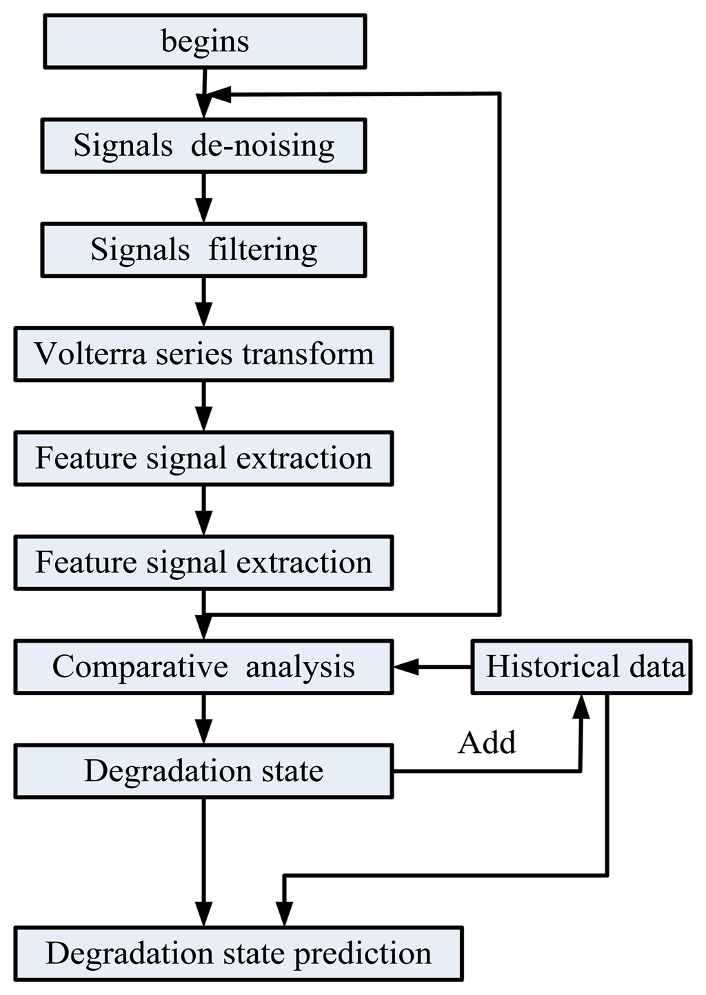 Highly reliable embedded systems have been widely applied in the fields of aerospace, nuclear power, high-speed rail, etc., which are related to security and economic development. The reliability of the power supply directly influences the security of the embedded system, and has been the research focus of numerous electronic information and energy studies. The degradation of power modules occupies a dominant position among the key factors affecting the power supply reliability. How to dynamically determine the degradation state and forecast the remaining useful life of working power modules is critical. Therefore, an online non-intrusive method of obtaining the degradation state of MOSFETs based on the Volterra series is proposed. It uses the self-driving signal of MOSFETs as a non-intrusive incentive, and extracts the degradation characteristics of MOSFETs by the frequency-domain kernel of the Volterra series. Experimental results show that the identification achieved by the method agrees well with the theoretical analysis.1. Introduction
