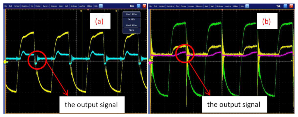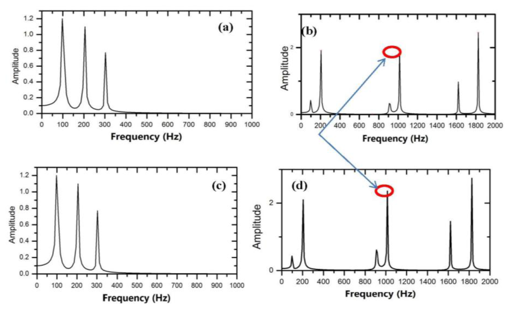 Figure 6 depicts the output signal. Figure 6a,b is the output signals, when MOSFET is normal and degraded, respectively. Figure 7 depicts the Volterra series transform for the output signal. Figure 7a,b is the first-order and second-order nuclear output spectrum, respectively, when the MOSFET is normal.