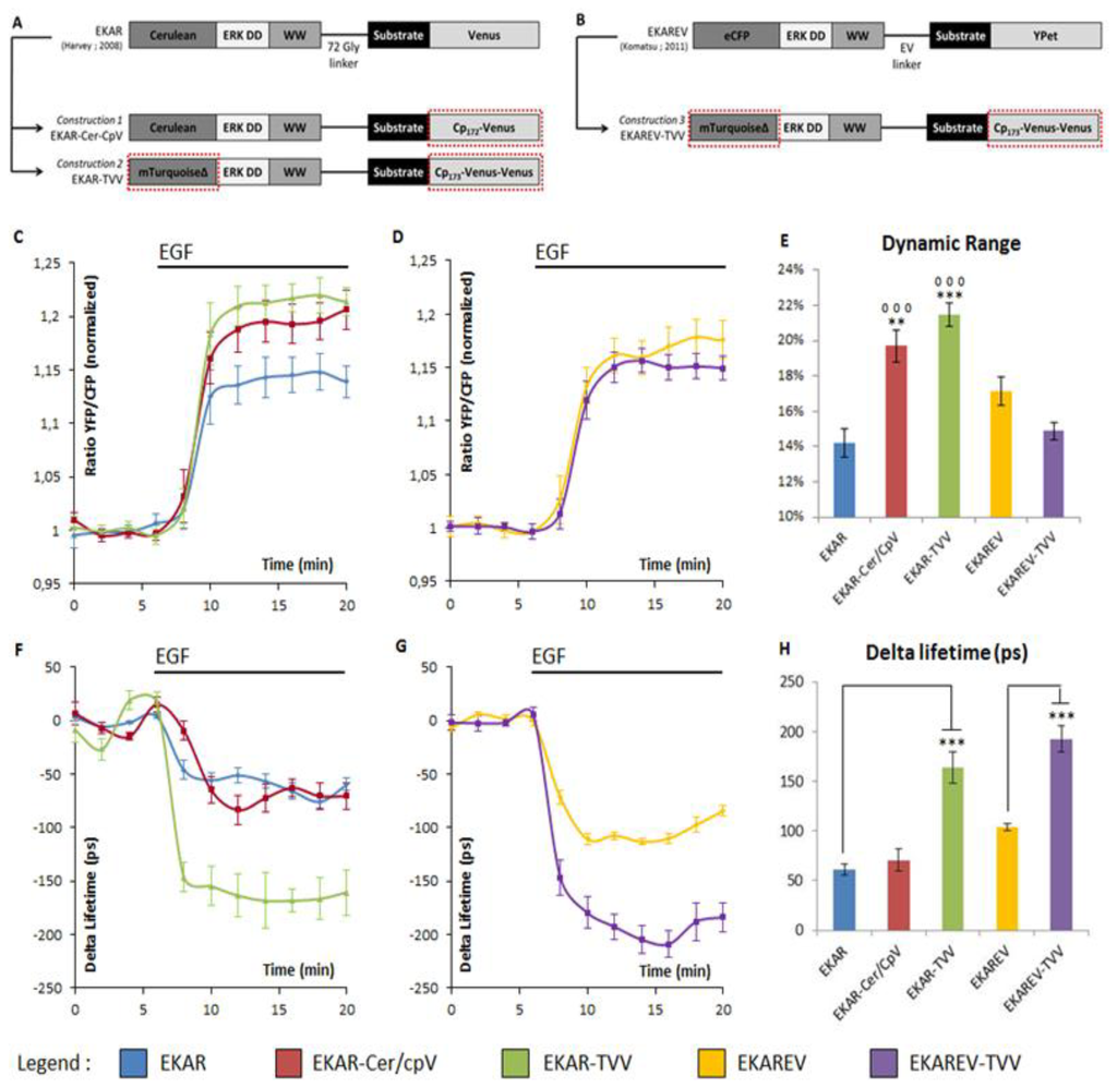 To summarize, our ERK sensor EKAR-TVV, based on the molecular recognition element of EKAR coupled to a FRET pair composed of mTurquoise and a dimer CpVenus-Venus FPs, exhibited an increase dynamic range in both techniques contrary to EKAR-Cer-CpV, which was improved for ratio experiments but did not show any difference with the original sensor when tested in FLiM.