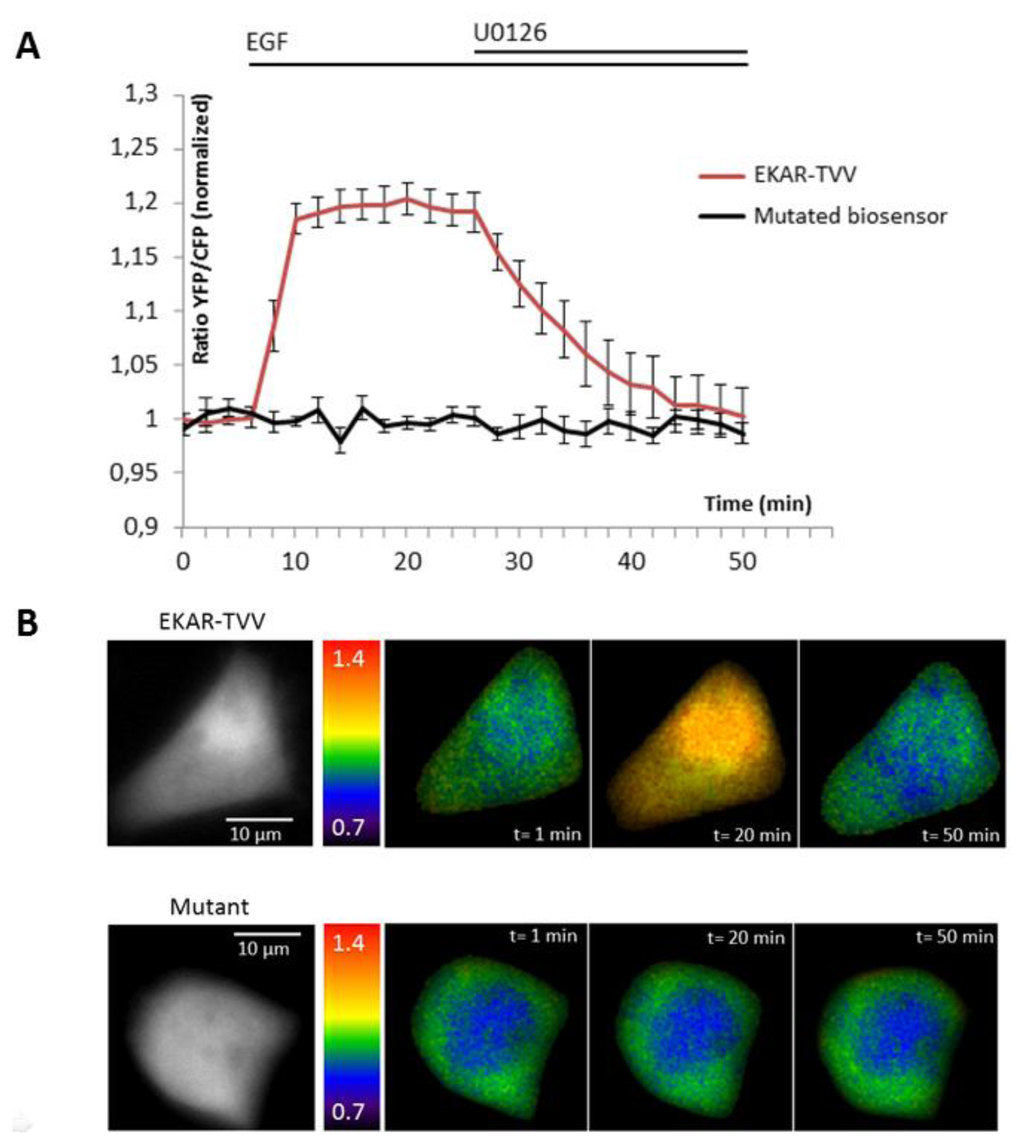 The ability of the biosensor to be dephosphorylated and return to its original conformation, when kinase activity decreases or stops, is a critical parameter. Since many kinases are regulated by negative feedback loops or more specifically if we take the sustained/transient activation of MAPK, a non-reversible probe would lead to wrong interpretation of physiological events, because we will be only able to detect the first activation step. To reverse the signal, the biosensor in its folded conformation has to allow the phosphatases to access to the phosphorylated site within the probe. We thus tested our best construction for each technique upon inhibition of the pathway by a chemical inhibitor of MEK, U0126 (Figures 2 and 3). Moreover, the relevance of kinase activity measurements needed to be controlled using a negative control biosensor. We obtained this probe by site-directed mutagenesis that replaced the phosphorylable amino acid within the substrate of the biosensor by a non-phosphorylable residue (e.g.,: threonine replaced by an alanine). We thus used a mutated biosensor to provide the evidence that FRET signal (increase or decrease) were not artifacts but corresponded to conformational changes of the probe (Figures 2 and 3).