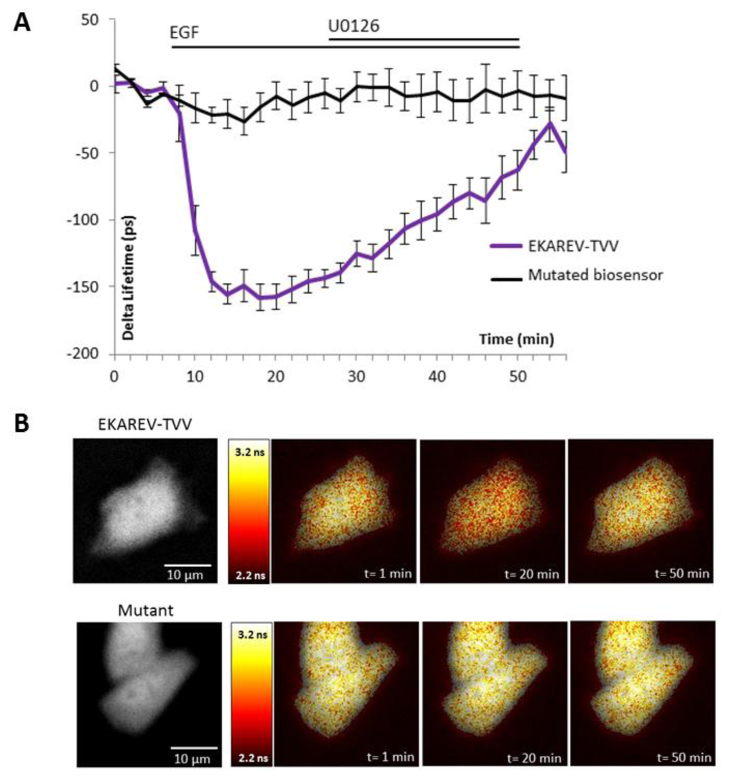 EKAR-TVV revealed the highest dynamic range in FRET ratio study. Following an EGF stimulation cells expressing this probe, cells were exposed to the MEK inhibitor U0126. The CFP/YFP ratio returned to a basal level when MAPK were inhibited, which demonstrated that EKAR-TVV sensing was reversible. The variations were compared to the mutated biosensor (Figure 2A). A representative cell expressing either EKAR-TVV or the mutated biosensor before and after drugs addition allowed us to localize activity variations (Figure 2B). We did the same experiment in FLiM with the sensor that exhibited in our hands the higher dynamical range for this technique: EKAREV-TVV. As expected following an exposure to U0126, the fluorescence lifetime increased to reach a basal level corresponding to ERK activity when cells were starved (Figure 3A). As previously we used a mutated biosensor as control and plotted the lifetime variations for each construction on a representative cell (Figure 3B).