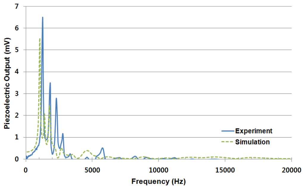 The corona-poling process was intended to enhance the piezoelectricity of the piezoelectric film. The piezoelectric constant of the poled piezoelectric film was measured with the Piezotest PM300 PiezoMeter System. The d33 value of piezoelectric constant was below 0.22 pC/N without any poling process and increased to 1.60–4.05 pC/N after the corona-poling process. Piezoelectric signal measurement from the electrodes on the McPAS while exposed to external sound source of 1 Pa (94 dBSPL) over the frequency range of 100 Hz and 20,000 Hz were conducted using a sound level analyzer and mouth simulator as shown in Figure 7. Figure 10 shows the resulting piezoelectric signal output in peak-to-peak voltage (Vpp) from line electrode #3 having maximum value of 6.33 mVpp at 1,250 Hz (−53 dBV/Pa, 0 dBV = 1 Vrms). Like the vibratory results, there are slight frequency offsets between the experimental and simulation results, but the overall patterns of the measured results are in good agreement with the simulation results.