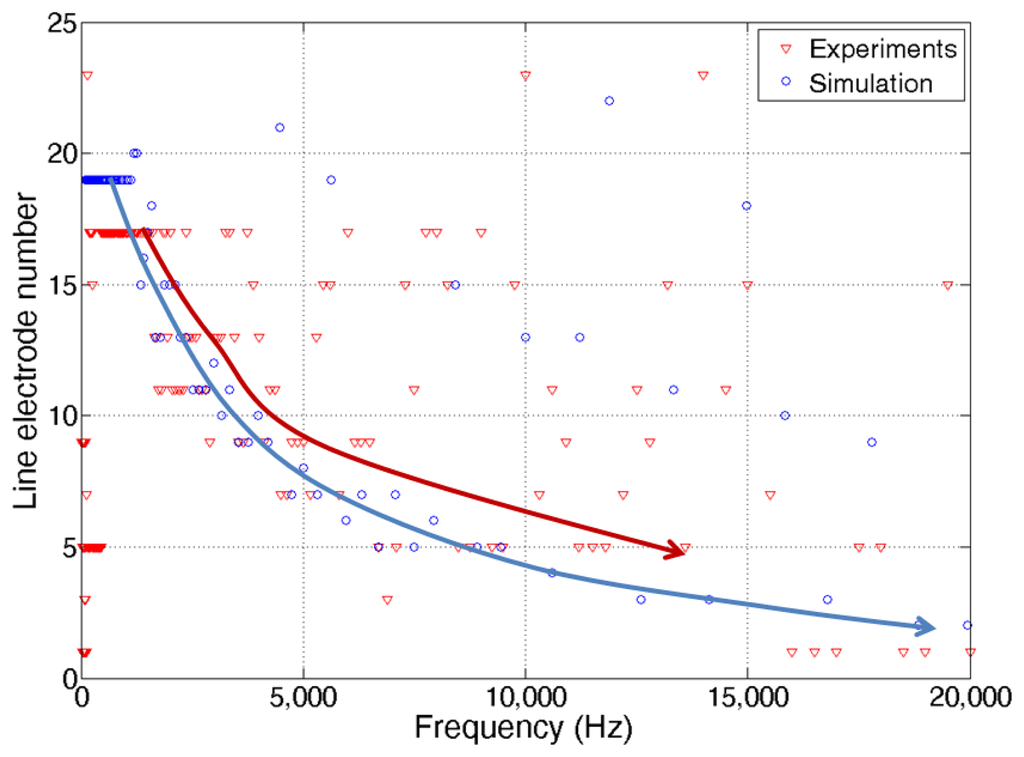 Additional experiments were carried out to determine the position or line electrode number of the maximum piezoelectric signal output at each input sound frequency (Figure 11). The experiment data show that at lower input sound frequency, line electrodes near the apex (high line electrode number) generated the maximum piezoelectric output while at higher input sound frequency, line electrodes near the base (low line electrode number) responded the most. The piezoelectric signal output simulation results are almost same as those of vibratory displacement. However, the measured maximum output positions are more scattered compared to those of vibratory displacement on the graph. Non-uniform piezoelectric constant measured over the membrane after corona-poling (1.60–4.05 pC/N) and the lesser number of measurement points (23 for displacement and 12 for piezoelectric signal) seem to affect the piezoelectric signal output performance.