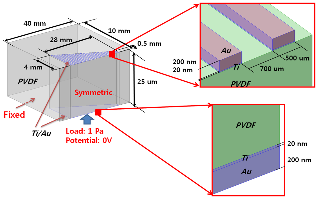 To evaluate the designed McPAS, multiphysics finite element analysis (FEA) was carried out with the COMSOL Multiphysics® software (COMSOL, Inc. Palo Alto, CA, USA). The FEA included both mechanical vibratory simulation and piezoelectric analysis with acoustic pressure load of various frequencies applied on the bottom of the membrane. The piezoelectric material properties of PVDF film reported by Tarn et al. [11] were used for the FEA. Detailed geometry and boundary/load conditions are shown in Figure 2.