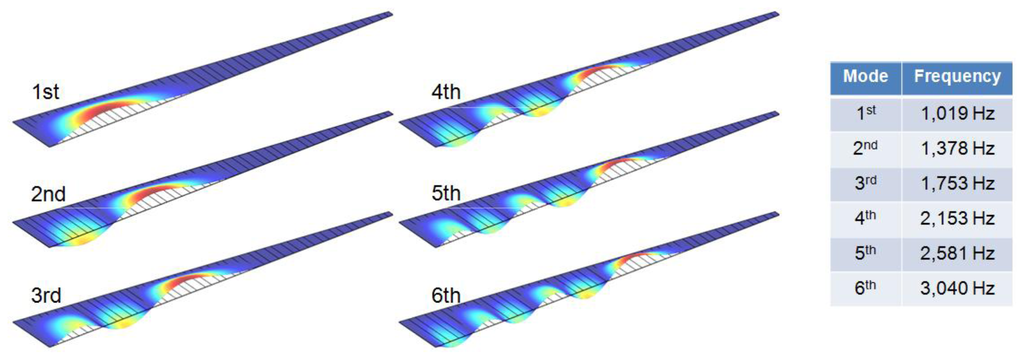 A finite element model was constructed to be half of the whole McPAS design (40 mm × 10 mm) and symmetric boundary conditions were applied to reconstruct the whole design simulation. Gold (Au) electrodes are present on both sides of the PVDF membrane for piezoelectric output. On the bottom nodes of the movable area (trapezoid shape), 1 Pa (94 dB SPL) sinusoidal pressure load was applied with potential condition of 0 V. A mode analysis of the McPAS model realized with COMSOL Multiphysics® was carried out up to sixth mode (Figure 3). The colors and deformation indicate relative displacement of each point on the membrane. The local resonant position, which has maximum displacement (red color), changes gradually from apex area (wide width) to base (narrow width) area as mode number increases in a similar fashion as reported previously [7,10]. The frequency separation simulations in terms of vibratory behavior and piezoelectric signal output of the McPAS were also carried out and compared with experimental data (Figures 9, 10 and 11).