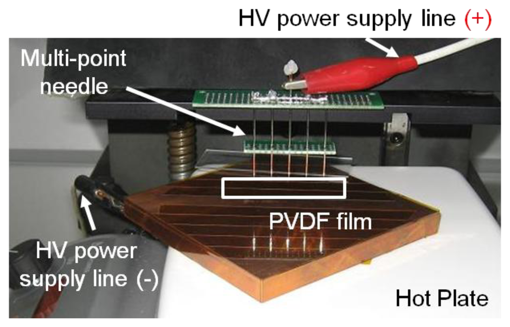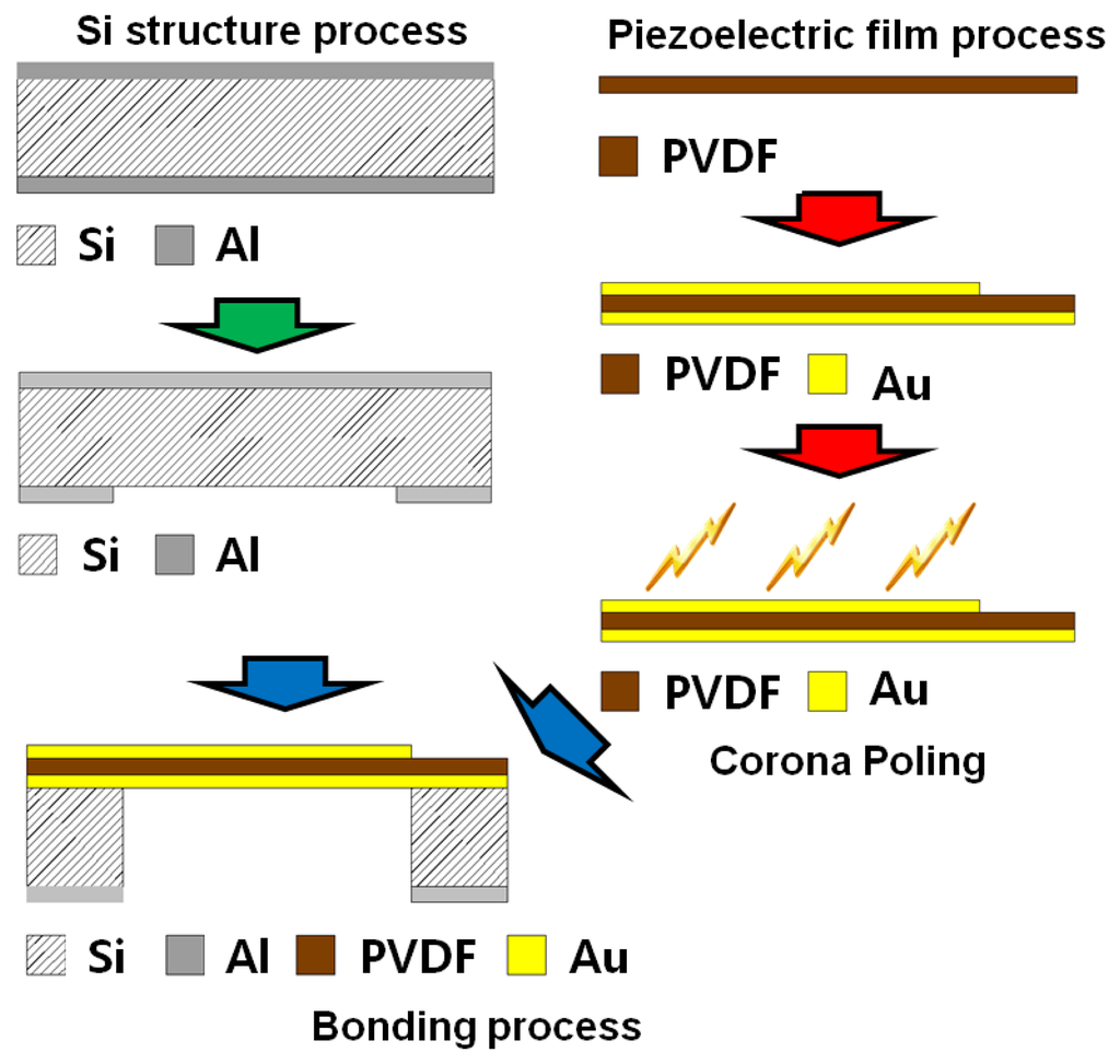The fabrication steps can be divided into three phases: fabrication of the Si structure, piezoelectric film process and bonding process (Figure 4). The piezoelectric film used in this research is a polyvinylidene difluoride (PVDF) film of 25.4 μm thickness (Kynar® Film, Professional Plastics, Singapore). First, a 300 nm thick aluminum (Al) masking layer was deposited on the front side of a Si wafer. Positive photoresist (AZ 1512, AZ Electronic Materials (Korea), Anseong, South Korea) was spin-coated and cured on the front side and a trapezoid opening was defined through ultra-violet (UV) light exposure and development. The exposed Al layer was etched first and residual photoresist was stripped away. Lift-off resist, photoresist and Al passivation layers were deposited in series on the bottom side of the substrate as masking layers. Finally, the trapezoid opening was realized with through-Si dry etching. The passivation layers were stripped after etching process. Second, 20 nm/200 nm thick titanium (Ti)/gold (Au) layers were deposited with a shadow mask on one side of a PVDF film with e-beam evaporator (KVET-C500200, Korea Vacuum Tech., Gimpo, South Korea) at the National NanoFab Center (NNFC, Daejeon, South Korea). The shadow mask was made of stainless steel and has openings for 23 line electrodes and 12 electrical pads. Additional thin metal deposition was carried out without a mask on the other side of the piezoelectric film. To enhance its piezoelectric property, a corona-poling process was followed on the processed PVDF film. The film was heated to 80 °C on a copper (Cu) block placed on a hot plate. After turning off the hot plate, high electric field was applied between the Cu block and needles positioned over the film for 60 min. The applied voltage was 7.5 kV and the distance between the Cu block and needles was 20 mm (Figure 5). The piezoelectric constant of the poled piezoelectric film was measured with PiezoMeter System (PM300, Piezotest, London, UK). The processed piezoelectric film was pre-stretched on a bonding pad and bonded onto the Si substrate with a trapezoid opening with the bottom side of the film facing the Si substrate.