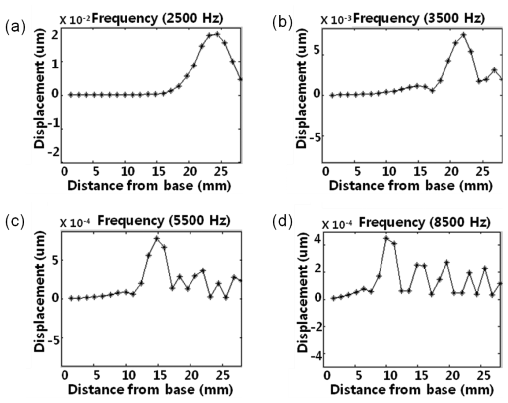 The local resonant behaviors of the membrane were measured at the central points of 23 line electrodes on the membrane using the scanning LDV system. The McPAS has a gradually varying membrane width from 1 mm at y = 0 mm to 8 mm at y = 28 mm. The measured local resonant responses of the membrane are shown in Figure 8. With a sound source of 2.5 kHz, the local resonance took place near the apex area (y = 23.7 mm) and there was one maximum. However, the sound sources of 3.5 kHz, 5.5 kHz and 8.5 kHz created local resonant responses near y = 21.3 mm, y = 14.1 mm and y = 9.3 mm, respectively. As the frequency of sound source increased, the position showing the local resonant response moved closer to the base (y = 0 mm).