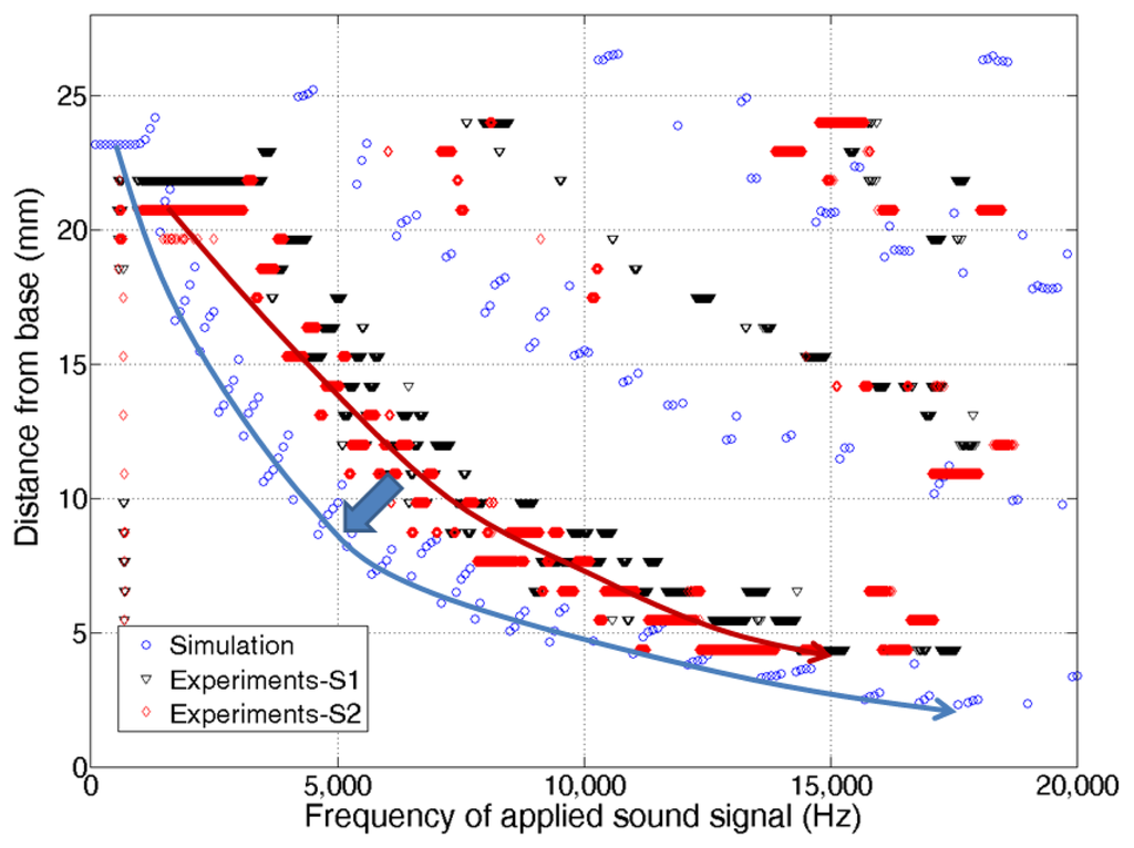 To characterize its frequency response more in detail, the measured local resonances were further analyzed and compared with simulation results. For simulation, acoustic pressure (or load) over the frequency range of 100 Hz–25,000 Hz with 100 Hz steps was applied on the bottom side of membrane of the developed model (Figure 2) as sound source. Figure 9 shows experimental data of two McPASs (S1, S2) and FEA simulation results displaying the y-position of the largest resonant peak along the centerline at each applied sound source with different frequencies. The position of maximum displacement changes gradually from the apex area to base area as the frequency of input signals varies from 2.5 kHz to 13.5 kHz, demonstrating the capability of the McPAS to act as an artificial basilar membrane or frequency analyzer. Several test samples were fabricated and characterized. There were small discrepancies in the experimental data between test samples. Both simulation and measurement results show quite similar frequency response patterns, but there are discrepancies between the positions of largest resonant peaks. These discrepancies seem to arise from surface tension present on the membrane which is created during the fabrication process.