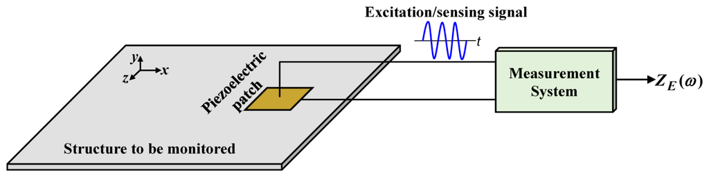 Figure 1 shows a square piezoelectric patch that is attached to the structure to be monitored. The measurement system simultaneously excites the patch through an excitation signal with an appropriate frequency (ω) and acquires the corresponding response signal that provides the electrical impedance (ZE(ω) of the patch. Thus, the piezoelectric device operates simultaneously as an actuator and a sensor in the EMI method. The electrical impedance signature is obtained in the same frequency range within which the excitation signal is generated.