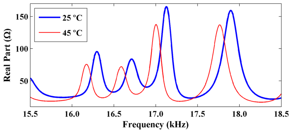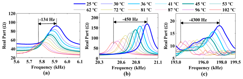 The three resonance peaks clearly exhibited left frequency shifts as the temperature increased. However, these shifts were not constant at a given temperature but increased with the frequency of the resonance peak. Therefore, the frequency shifts depended on both the temperature and the frequency. The figures show that increasing the temperature from 25 °C to 102 °C produced a frequency shift of Δf = −134 Hz relative to the impedance signature at 25 °C for the resonance peak at 5.91 kHz. The frequency shifts for the resonance peaks at 20.95 kHz and 197.80 kHz were Δf = −450 Hz and Δf = −4,300 Hz, respectively, for the same temperature variation.
