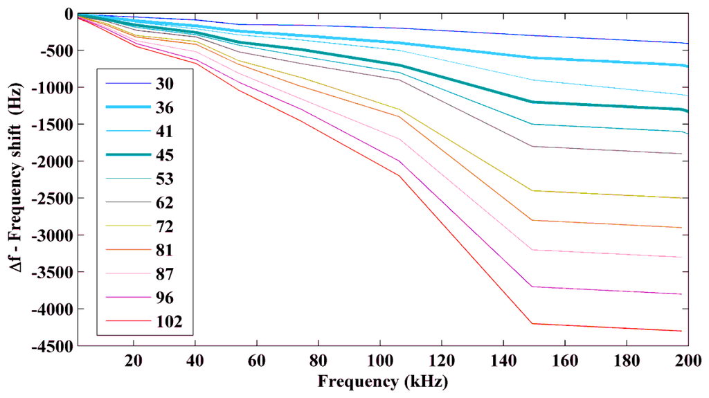 Figure 13 shows the frequency shifts (Δf) relative to the impedance signature obtained at 25 °C as a function of the frequency for temperatures ranging from 30 °C to 102 °C.