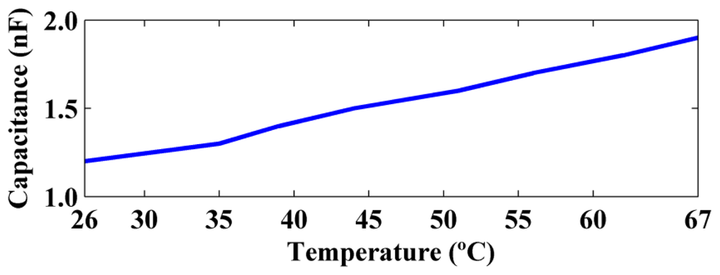 In addition to the frequency shifts in the impedance signatures, variations in the amplitude of the impedance signatures were also observed. Equation (5) shows that the piezoelectric sensors are predominantly capacitive devices with a capacitance C0. Therefore, it was important to analyze the variation of the capacitance with temperature. Figure 14 shows how the capacitance varied for temperatures between 26 °C and 67 °C.