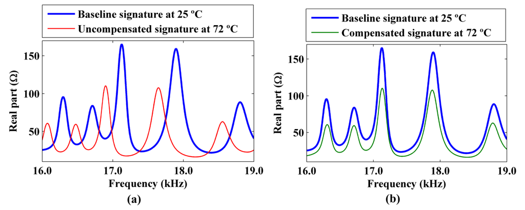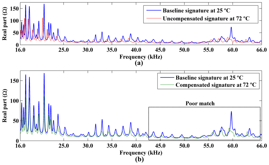 Figure 15 shows the uncompensated and compensated real part of the impedance signature that was obtained at 72 °C relative to the baseline signature obtained at 25 °C using a narrow frequency band of 16–19 KHz.