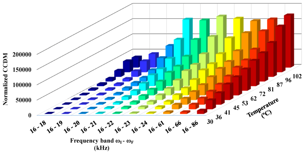 Figure 18 shows the normalized CCDM indices that were obtained for the healthy structure after applying the compensation method for temperatures ranging from 30 °C to 102 °C and using different frequency bands (ωI−ωF) in Equation (8). Again, the real part of the impedance signature that was obtained at 25 °C was used as the baseline.