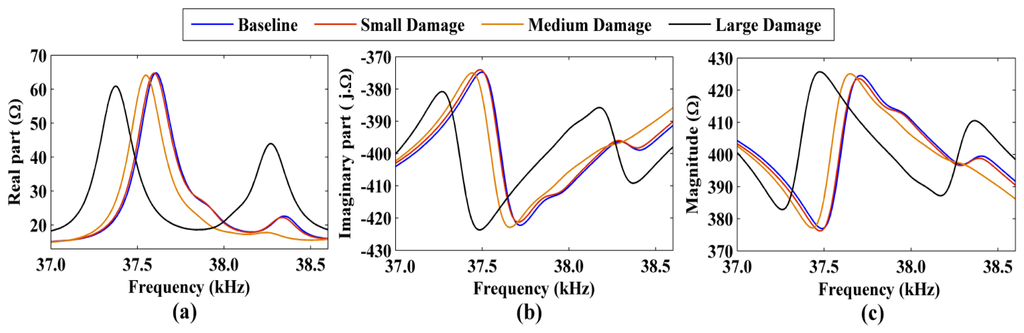 In addition, the real part, the imaginary part, and the magnitude of the impedance signatures exhibited the same resonance peaks and frequency shifts, although the peaks were more prominent for the real part and resulted in higher damage indices, as shown in Figures 7 and 6, respectively.