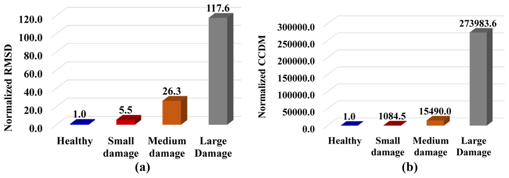 The results showed that the system exhibited a high sensitivity for detecting structural damage. Although the nail-head induced a low damage level (i.e., only approximately 0.016% of the mass loading), the CCDM index was 1,084.5 times higher than that obtained for the healthy structure. The values obtained for the medium and large damage levels were 15,490.0 and 273,983.6 times higher, respectively, than the value obtained for the healthy structure. Lower values of the RMSD index of 5.5, 26.3 and 117.6 were found for the low, medium and large damage levels, respectively.