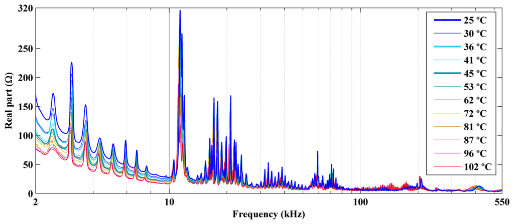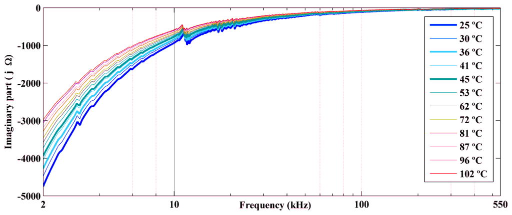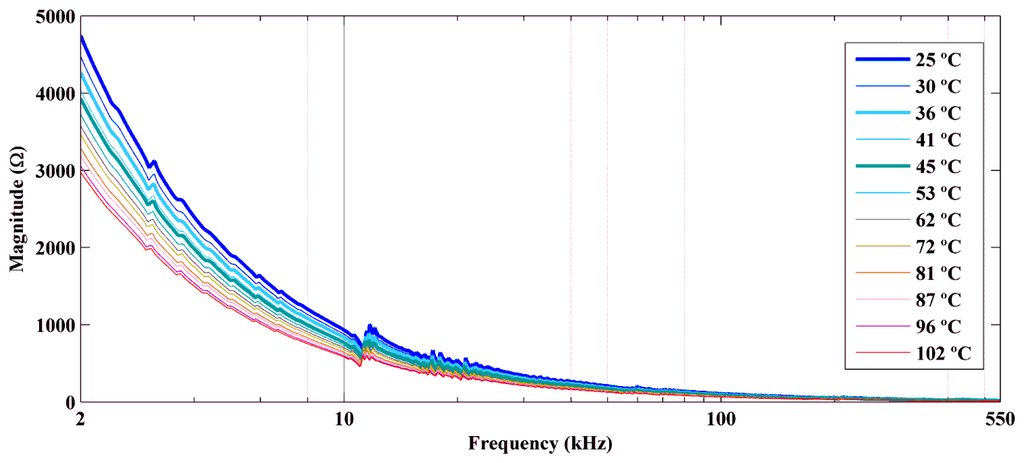 We performed experiments for temperatures ranging from 25 °C to 102 °C. Figures 7 and 9 show the real part, the imaginary part, and the magnitude of the electrical impedance signatures, respectively, over a frequency range of 2–550 kHz. The frequency axis is shown on a logarithmic scale to facilitate comparison of the data. Frequencies below 2 kHz are not shown, because the impedance in this frequency band was very high and would make data comparison more difficult.