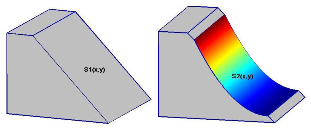 With the simulated LiDAR data at hand, we can then estimate the surface S2(x, y) by using each of the three estimation methods given in Section 2 and further compute the estimated volume of the mass due to the landslide, which can be symbolically written as follows: