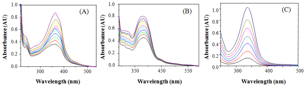 Figure 1A,B shows the absorption spectra of BS1 and BS2. The former displays a well-defined band at 360 nm (molar extinction coefficient of 22,830 M−1 cm−1). In the case of BS2 its absorption spectrum exhibits a well-defined band at 364 nm (molar extinction coefficient of 18,600 M−1 cm−1).