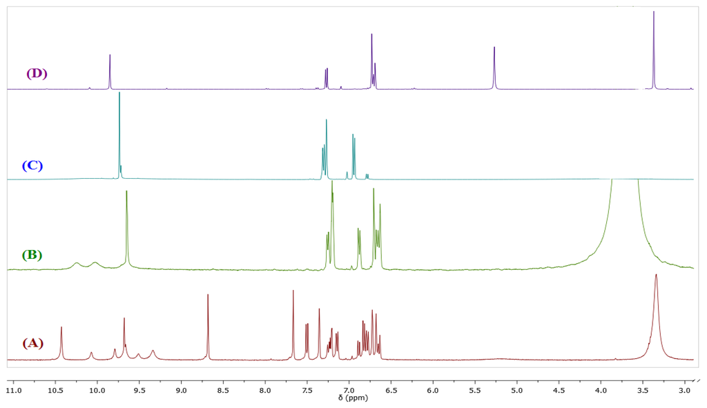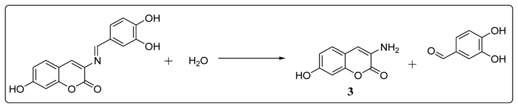 Figure 4 depicts the spectra of BS1 (1 mM in part A), when adding 10% of water to BS1 (part B), and of its precursors, 3,4-dihydroxybenzaldehyde (part C) and 3-amino-7-hydroxy-2H-chromen-2-one (3) (part D). Spectrum (B) shows the disappearance of some characteristic resonances of BS1 and depicts features that are present in both spectra (C) and (D). Based on these NMR results we propose that BS1 indeed undergoes hydrolysis giving rise to its precursors, i.e., 3-amino-7-hydroxy-2H-chromen-2-one (3) and 3,4-dihydroxybenzaldehyde.