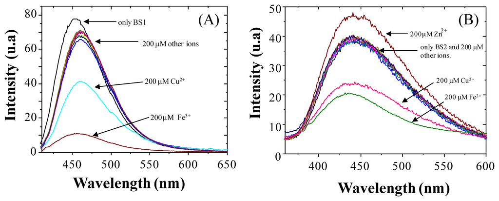 To examine the molecular recognition of a variety of different metal cations by BS1 and BS2 we conducted fluorescence spectroscopy studies. As shown in Figure 2A,B, the fluorescence exhibited by each compound decreases in the presence of Cu2+/Fe3+ ions. It is important to note that other metal ions of interest (at 200 μM concentration) failed to show any significant interference at 458 nm for BS1 and at 437 nm for BS2. However, for BS2 a slight fluorescence increase was observed when a concentration of 200 μM of Zn2+ was added.
