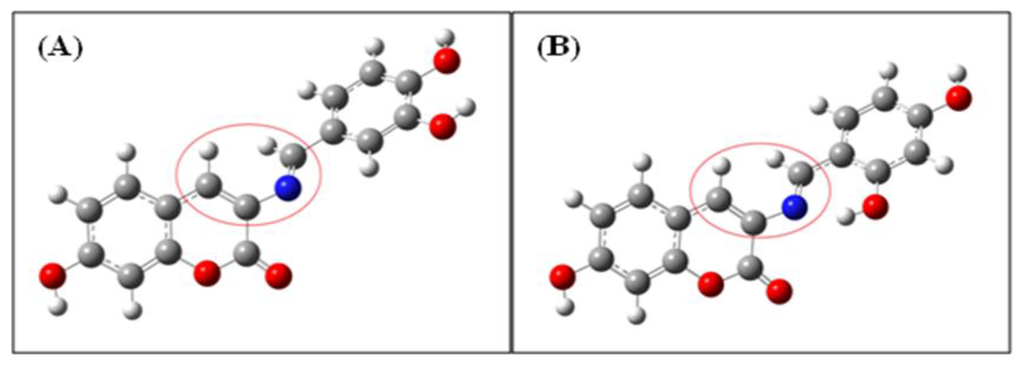 To assess the stability of BS2 in comparison with BS1, a theoretical study within the framework of Natural Bond Orbital (NBO) analysis was carried out [31]. This procedure shows that the proposed intramolecular hydrogen bond for BS2 has a distance of 1.738 Å and energy of 30.88 kcal mol−1. These values are within the established range for strong hydrogen bonds [32,33]. Therefore, the stability of BS2 could be associated with this intramolecular interaction. In addition, Table 3 and Figure 7A,B shows that for BS1 and BS2 their dihedral angles (between atoms depicted inside the red circles in Figure 7) decrease from 44.22° for BS1 to 41.03° for BS2. The latter could be another consequence of the presence of the intramolecular hydrogen bond formed between the hydrogen of the hydroxyl group and the nitrogen atom of the imine group present in BS2.