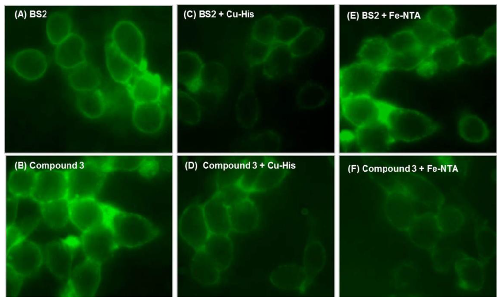 First, to determine the cell permeability of BS2 or 3, the cells were initially incubated either with BS2 or 3, under physiological conditions. Figure 8A,B shows that both probes have the ability to penetrate the cell and generate a fluorescent signal distributed throughout the cytoplasm. From recent work [34] showing the intracellular localization of fluorescent probes in living cells it is expected that BS2 will be more uniformly distributed in the cytoplasm, while 3 would be expected to accumulate in lysosomes. After adding Cu2+-histidine complex as a source of Cu2+, a decrease in the fluorescence intensity is observed (Figure 8C,D). In the case of cells incubated with BS2 the addition of Fe3+ as Fe-NTA complex was not associated with changes in the fluorescence intensity (Figure 8E). The latter result could be explained considering that BS2 is unable to remove Fe3+ ion from the Fe-NTA complex, due to the high value of the Fe(III)-NTA stability constant (Ka = 1012) [35].