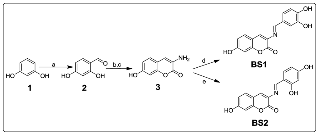 As shown in Scheme 1, resorcinol (1) was formylated (Vilsmeier-Haack conditions) giving 2,4-dihydroxybenzaldehyde (2), which was subsequently condensed (Knoevenagel reaction) with acetylglycine and hydrolysed in one step to afford 3-amino-7-hydroxycoumarin (3). The coumarin was condensed with 3,4-dihydroxybenzaldehyde or 2,4-dihydroxybenzaldehyde to obtain BS1 and BS2, by analogy with a literature procedure [26,27].